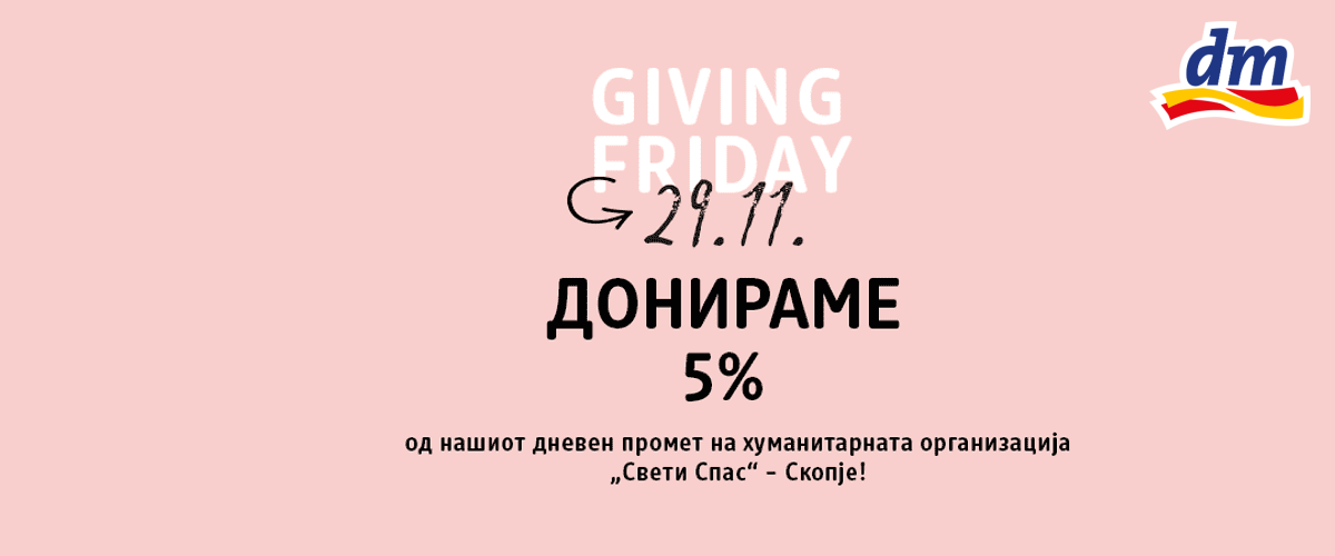 Шеста година по ред, во dm дрогериите наместо посебни попусти за светски познатиот Black Friday, тие организираат Giving Friday – донираат 5% од вкупниот промет од сите dm дрогерии остварен на 29.11.2024 во хуманитарни цели!