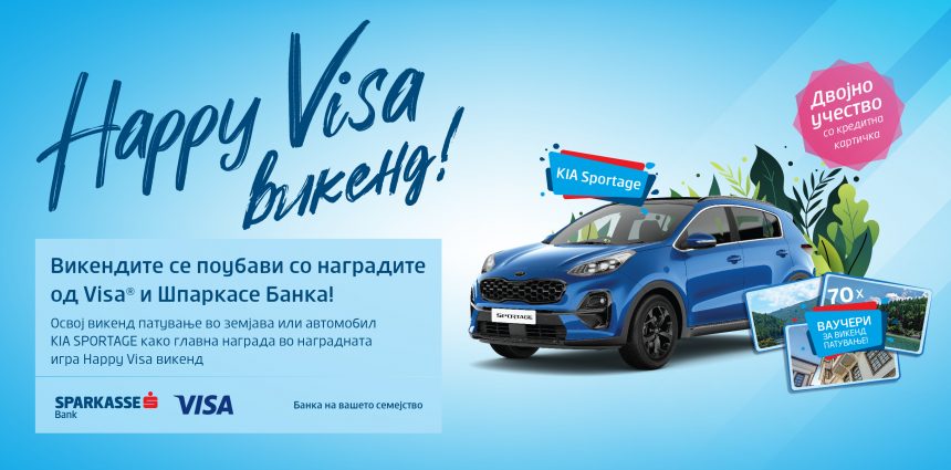 Од денес започнува наградната игра „Happy Visa викенд“ за сите клиенти на Шпаркасе Банка Македонија, корисници на дебитни и кредитни картички Visa, кои со секоја трансакција на износ поголем или еднаков на 500,00 денари, имаат можност да освојат една од многубројните награди: