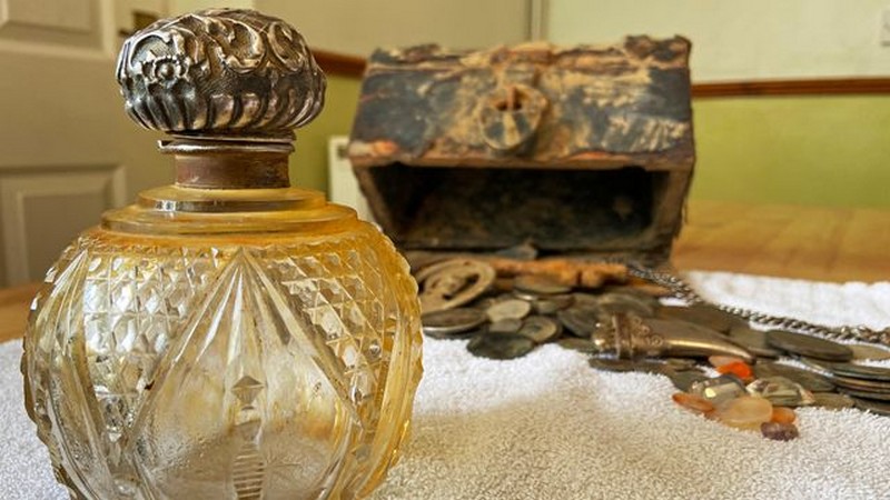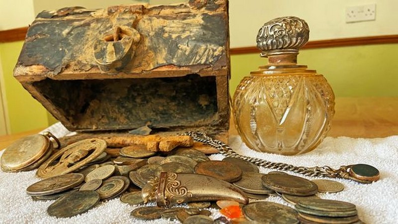 Во ковчегот што го пронашла Џени Фицџералд имало околу 100 стари монети, скапоцени камења, ‘рѓосан џебен часовник и прстен.