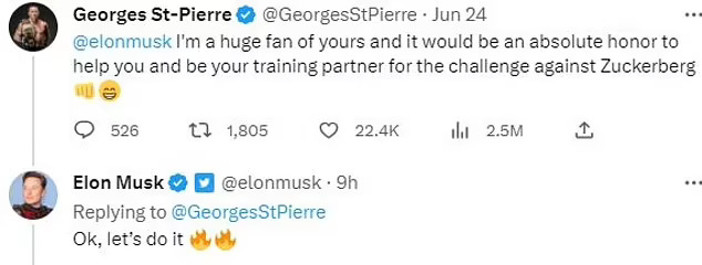 Илон Маск ја прифати сензационалната понуда од легендата на УФЦ, Жорж Сент Пјер. Сент Пјер му се обрати на Маск на 24 јуни, велејќи: „Јас сум твој голем обожавател и би ми било апсолутна чест да ти помогнам и да бидам ваш тренер за предизвикот против Цукерберг“. 51-годишниот Маск сега конечно одговори три дена подоцна, велејќи: „Добро, ајде да го направиме тоа“.