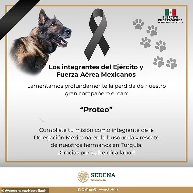 Се продолжува: „Припадниците на мексиканската армија и воздухопловните сили длабоко жалат за загубата на нашиот голем придружник, кучето „Протео“, ја исполнивте вашата мисија како член на мексиканската делегација во потрагата и спасувањето на нашите браќа во Турција. Ние сме горди на вас“.