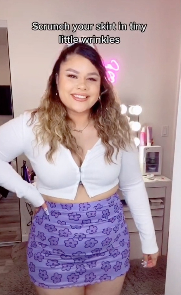 „Внимание кралици со облини, не носете го здолништето вака, носете го вака“, започна таа во своето видео на ТикТок. Таа носеше здолниште со цветен принт од лаванда.