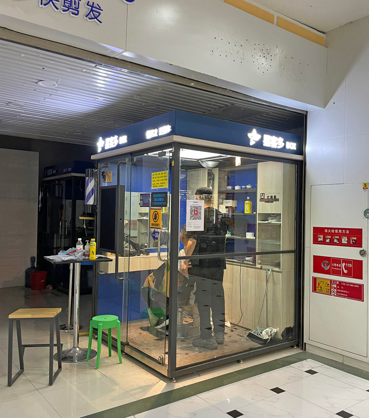 „Оваа берберница е во мобилна проѕирна кутија“.