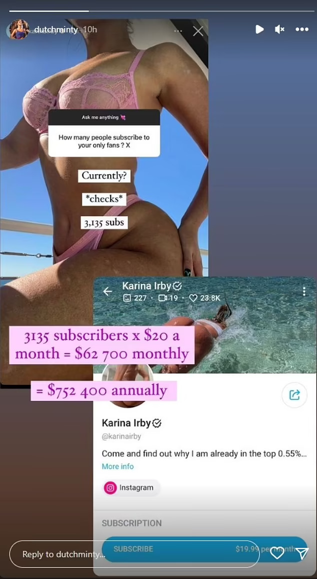 За време на прашања и одговори на Инстаграм, Карина откри дека има 3.135 претплатници на OnlyFans, ставајќи ја во првите 0,55 проценти од креаторите. Со 20 долари месечна претплата, тоа значи дека таа заработува неверојатни 62.700 долари месечно или 752.400 долари годишно. Тоа е повеќе од годишната плата на премиерот Ентони Албанес од 549.250 долари.