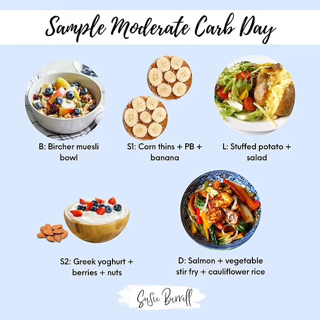 Еден добар ден со умерени до ниски јаглени хидрати може да вклучува мусли за појадок, разредена пченка со путер од кикирики и банана како ужина, полнети компири и салата за ручек и пржен со лосос и зеленчук со ориз од карфиол за вечера.