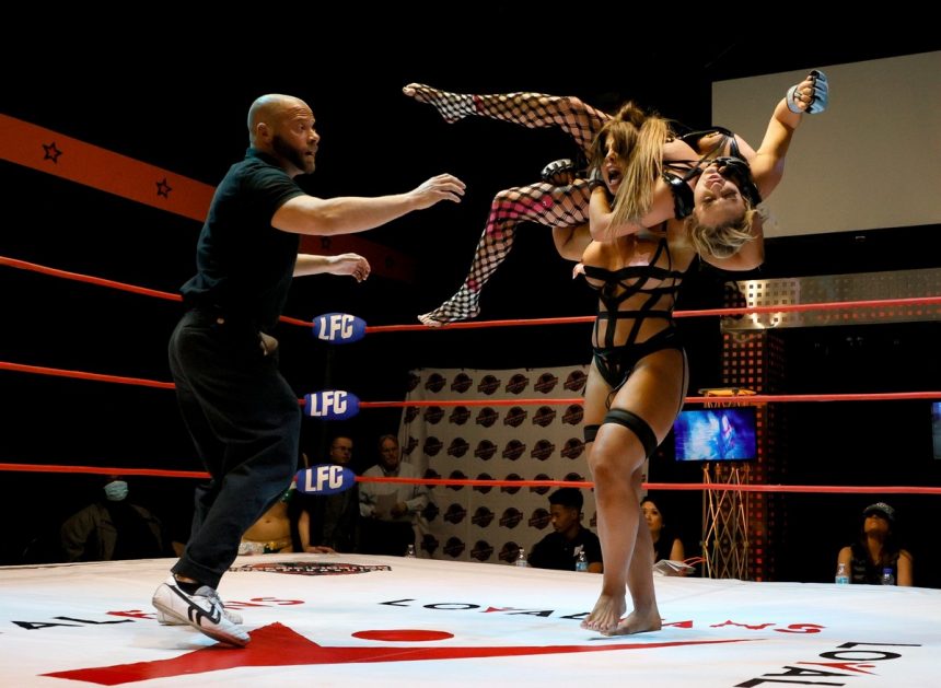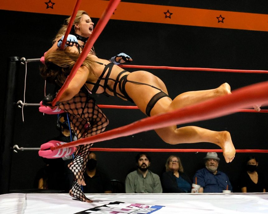 Четиринаесет жени се соблекоа во тантела долна облека, налепници за брадавици и мрежести хулахопки оваа Ноќ на вештерките за да се борат во рингот за време на годишното првенство во борба во долна облека.