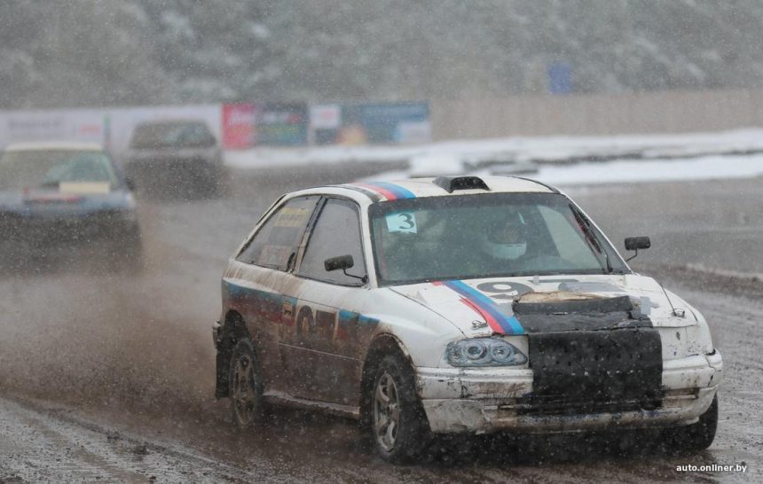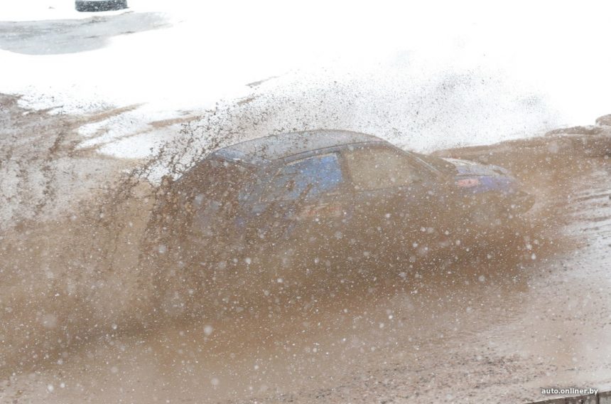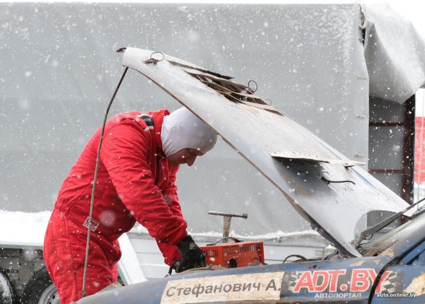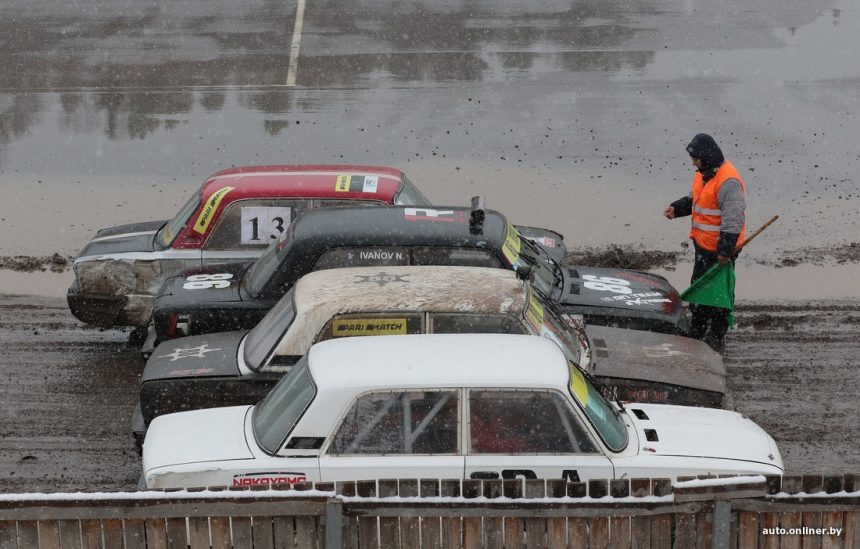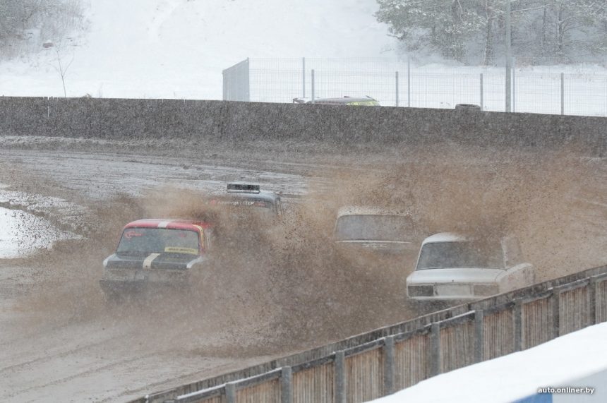 Силниот ветер, снегот и температурите нешто над нулата ја претворија патеката на стадионот Зарја кај Минск во непрекинат хаос од кал.