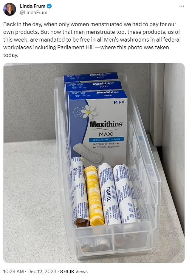 „Можете да потврдите дека вашите даночни долари сега обезбедуваат бесплатни тампони во машките тоалети на Парламентот на Канада. За „вработените кои имаат менструација“.