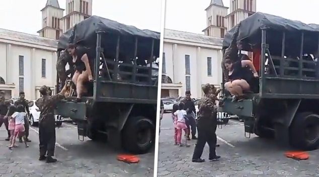 Војникот најљубезно ѝ подаде рака на дамата, а таа реши да се чалами и го откачи