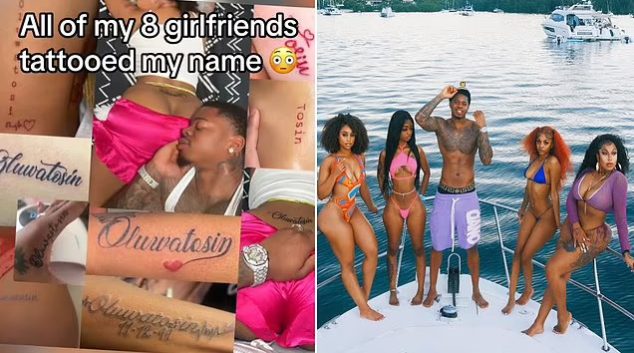 Олуватосин Тубо, од Атланта, Џорџија, сподели со бизарен клип кој оттогаш стана вирален. Се чини дека секоја од осумте девојки го има истетовирано неговото име. Олуватосин го сподели видеотозаедно со натписот на кој пишуваше: „Сите мои осум девојки го истетовираа моето име“. Тој беше толку горд што дури и ги сподели нивните имиња заедно …