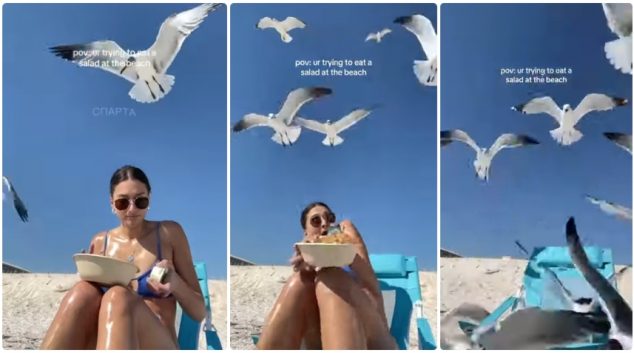 Девојката проба да јаде салата на плажа, ама само ПРОБА