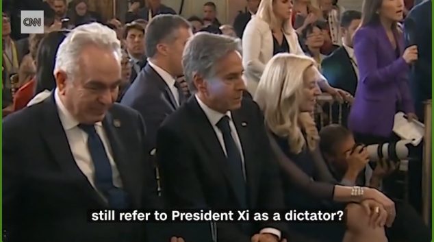 На снимката се гледа дека на американскиот државен секретар Антони Блинкен му се стемни пред очите. Американскиот претседател Џо Бајден изјави во средата дека сè уште верува оти кинескиот претседател Си Џинпинг е диктатор, иако двајцата лидери постигнаа напредок во нивните односи за време на состанокот надвор од Сан Франциско. „Па, погледнете, тој е диктатор …