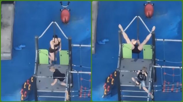 Комшиката уште рано наутро вежба на детско игралиште. Но, за што ли вежба?
