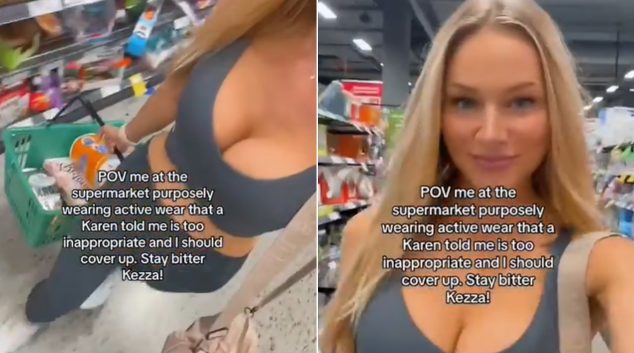 Инфлуенсерка ги насмеа своите следбеници на социјалните мрежи, откако објави видео објаснувајќи ја ситуацијата во која друга жена ѝ кажала дека нејзината спортска облека е „несоодветна” за во маркет. На видеото, русокосата се снимила како се шета низ гондолите во маркетот и носи корпа додека купува намирници. Даша го покажа своето деколте и стегнатата …