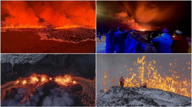 Огнена течност го осветлува зачаденото небо во Гриндавик, на само 50 километри од главниот град Рејкјавик. Реки од лава избувнаа од пукнатините исфрлајки фонтани од црвено- златна стопена карпа додека вулканот Фаградалсфјал еруптираше оваа недела. Ерупцијата започна во понеделникот вечерта, но не беше изненадувачки: областа беше активна веќе две години, а илјадници мали земјотреси …
