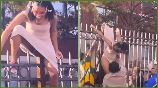 Прекачување со фустан преку шилеста ограда? Дефинитивно голем предизвик за девојка, а уникатна глетка за гледачите