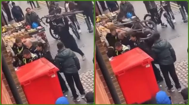Англичанецот очигледно многу е изнервиран од полицајците, па им удри еден велосипед од глава