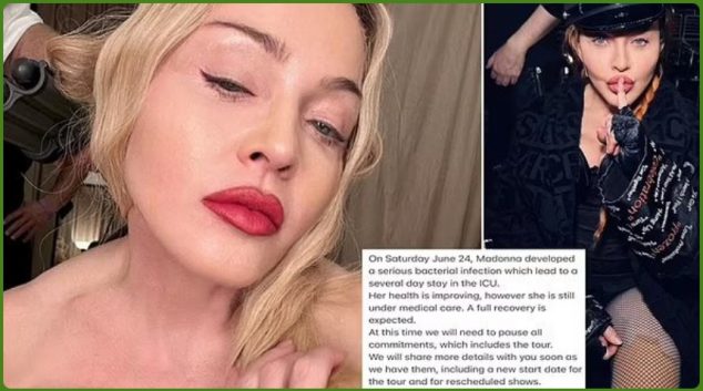 Мадона била пронајдена без свест во саботата во нејзиниот дом во Њујорк и итно била пренесена во болница каде била интубирана. Нејзината состојба била толку сериозна што роднините се подготвувале за најлошото. Менаџерот на пејачката, Геј Осеари откри дека Мадона боледува од сериозна бактериска инфекција и е принудена да ја одложи својата очекувана турнеја …
