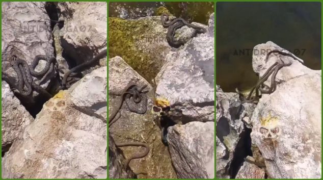 На Инстаграм страницата „antidroga07“ се појави видео од албанскиот пристанишен град Драч, на кое се гледаат испреплетени змии како се сончаат на карпите покрај морето. Но сепак утехата е дека змиите не се отровни, припаѓаат на воден вид наречен Natrix tessellata. Тие се во голем број затоа што во тој дел има голем број на …