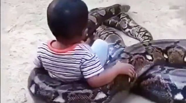 Бебето си игра со домашното милениче кое без проблем може да го проголта