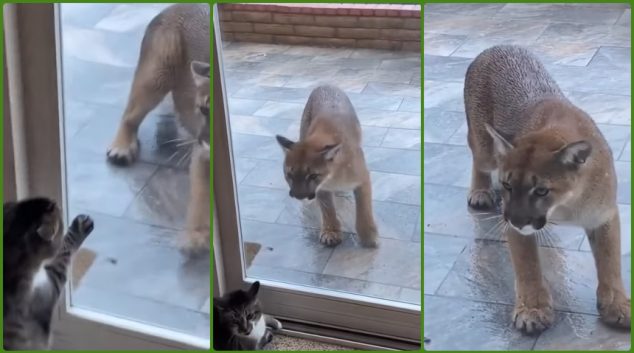 Мачката и нејзиниот поголем пријател се немаат видено одамна, добро е што ги дели стакло, инаку…