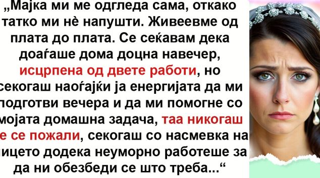 Свадбите треба да бидат среќни моменти, полни со љубов и зближување на семејствата. Но, замислете дека сте растргнати помеѓу она што го знаете цел живот и она што го очекува семејството на вашиот вереник. Тоа е ситуацијата во која се нашла една жена. Таа пораснала со нејзината самохрана мајка, која работела навистина напорно да се …