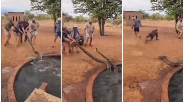 Питон против пет мажи кои се обидуваат да го извадат од вода за наводнување во Јужна Африка