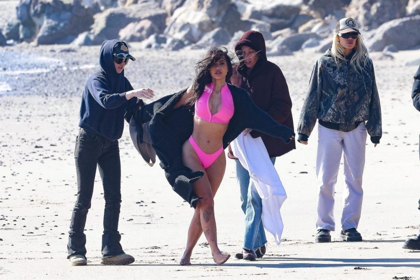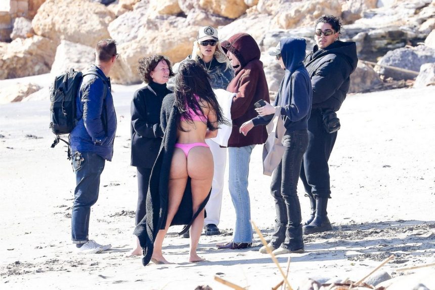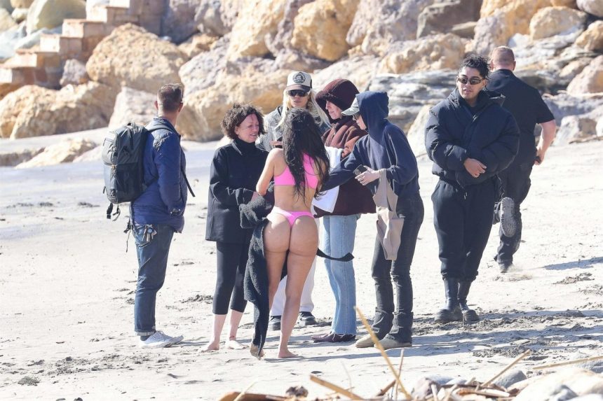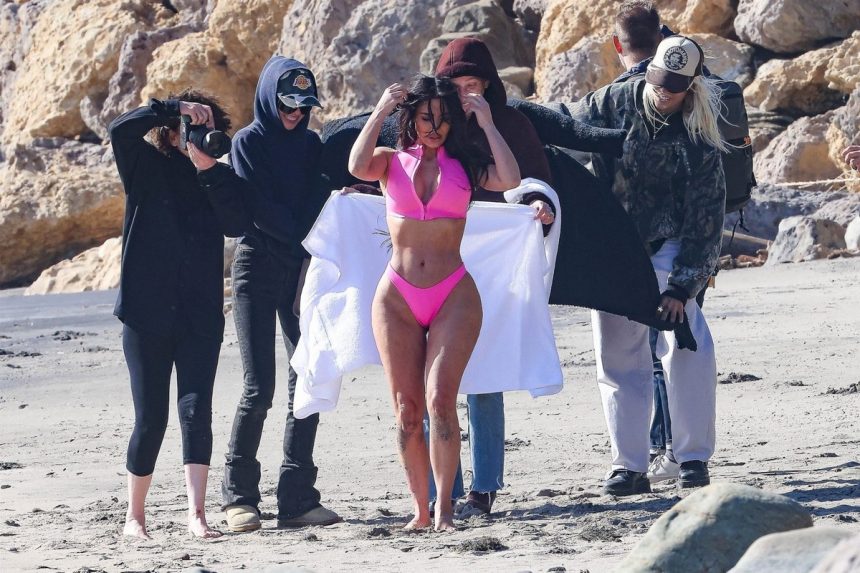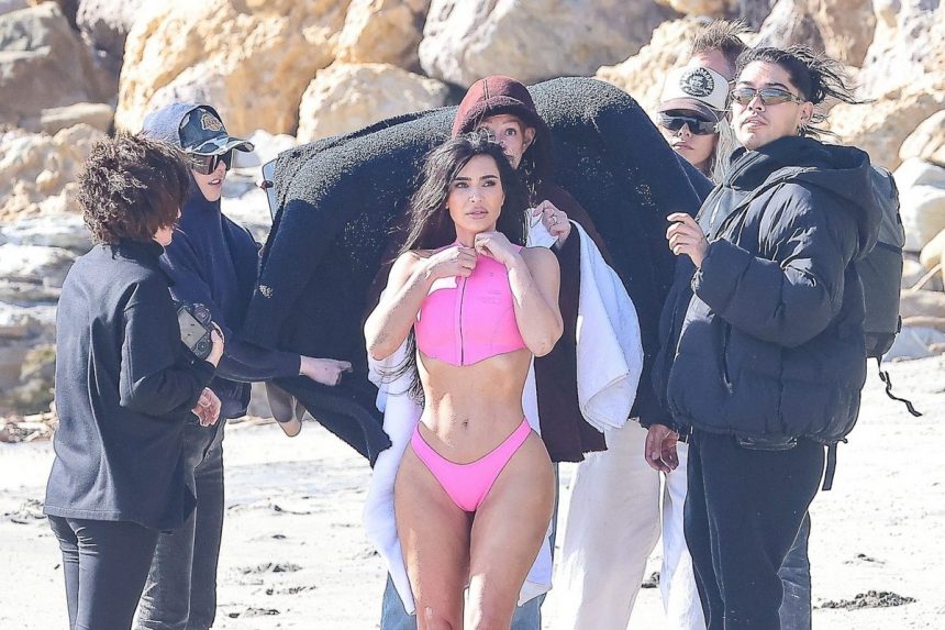 42-годишната американска реалити ѕвезда, актерка и претприемач Ким Кардашијан позира во бикини на плажа во Малибу.