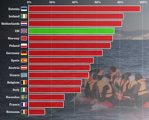 Британија, исто така, е рангирана значително повисоко од земјите на ЕУ, како што се Италија (46 отсто) и Грција (52,9 отсто), кои и двете се бореа со порастот на илегалните преминувања во Средоземното Море.