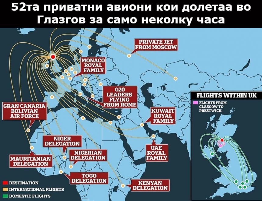 Во неделата, видовме најмалку 52 приватни авиони како слетуваат во Глазгов, додека проценките велат дека вкупниот број на летови за конференцијата е 400. Конзервативните предвидувања сугерираат дека флотата на приватни авиони што пристигна за COP26 ќе исфрли вкупно 13.000 тони јаглерод диоксид, еквивалентно на количината што ја исфрлаат повеќе од 1.600 Британци годишно.