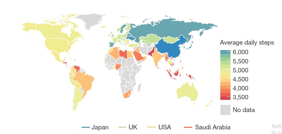 Луѓето во одредени земји имаат тенденција да преземаат повеќе чекори дневно од оние во други земји. Студијата од 2017 година ги следеше нивоата на активност на 717.527 луѓе во 111 земји во просек од 95 дена користејќи паметни телефони.