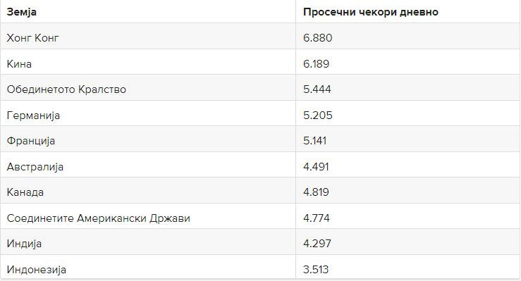 Земјата со најмногу чекори дневно е Хонг Конг , со просечни околу 6.880 чекори дневно . Од друга страна, земја со најмалку чекори дневно е Индонезија , со просечни околу 3.513 чекори дневно .