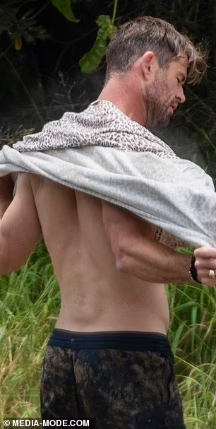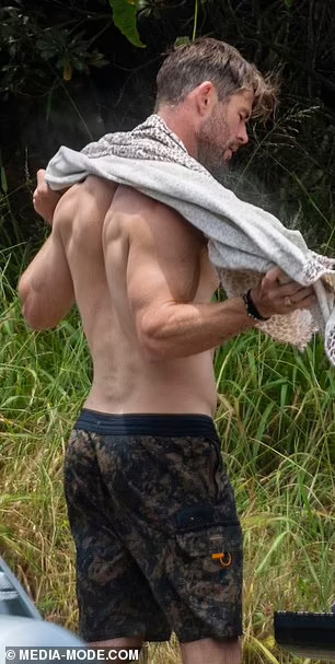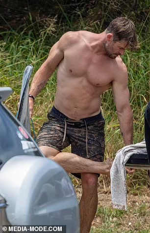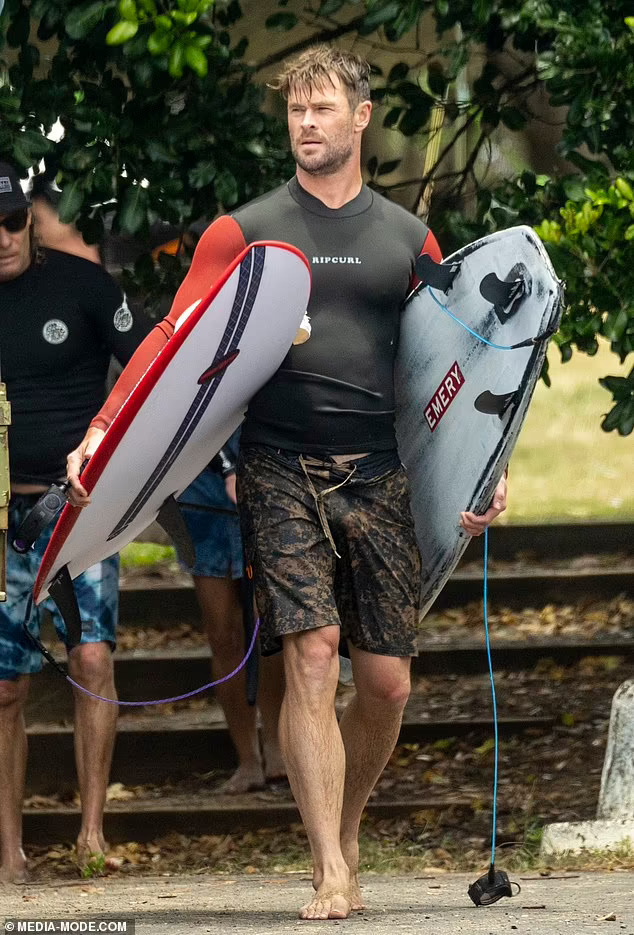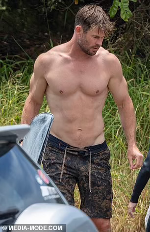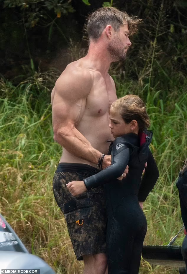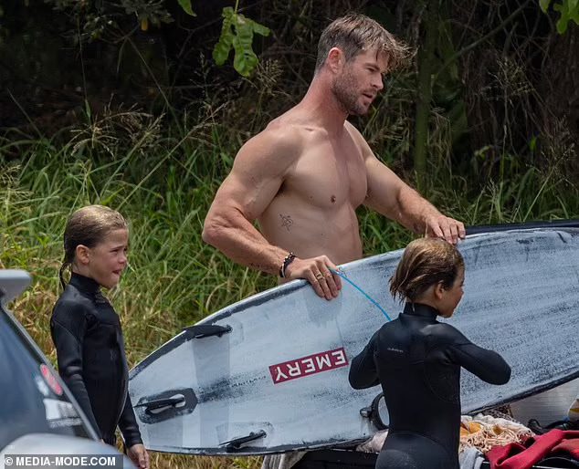 Крис Хемсворт ги покажува своите неверојатни испакнати бицепси и извајана фигура за време на патувањето со своите синови близнаци. Тој неодамна откри дека ќе паузира од актерството за да помине време со своето семејство откако откри дека е изложен на ризик од Алцхајмерова болест. Па беше виден како ужива во сурфање со неговите момчиња близнаци – Тристан и Саша, осум години – во заливот Бајрон во неделата попладне.