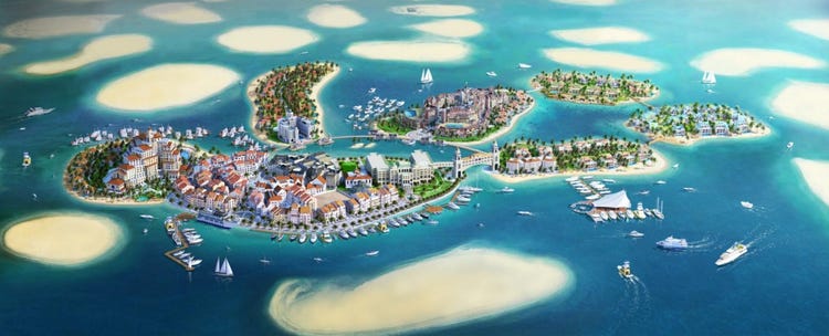 Тоа не е единствениот ваков проект – недалеку од него истите компании ги изградија познатите Палмови острови. Изградбата на Dubai World започна во 2003 година и заврши во 2008 година. Повеќе од половина од островот беше продаден на приватни инвеститори и тие требаше да станат туристички одморалишта со луксузни вили.