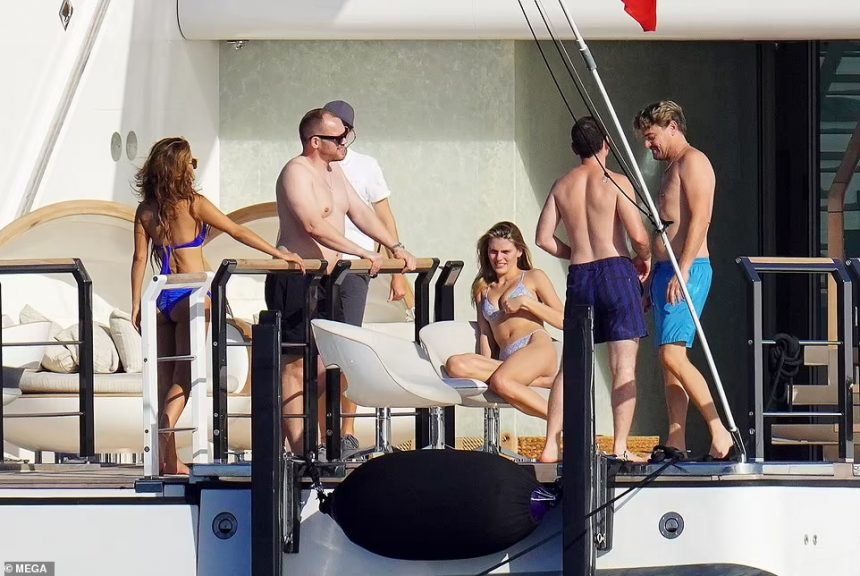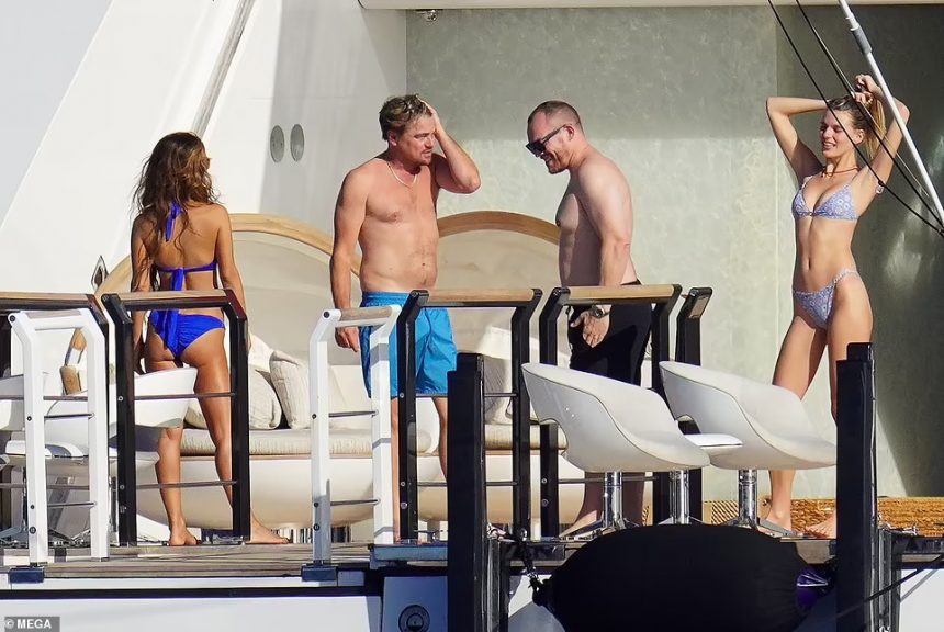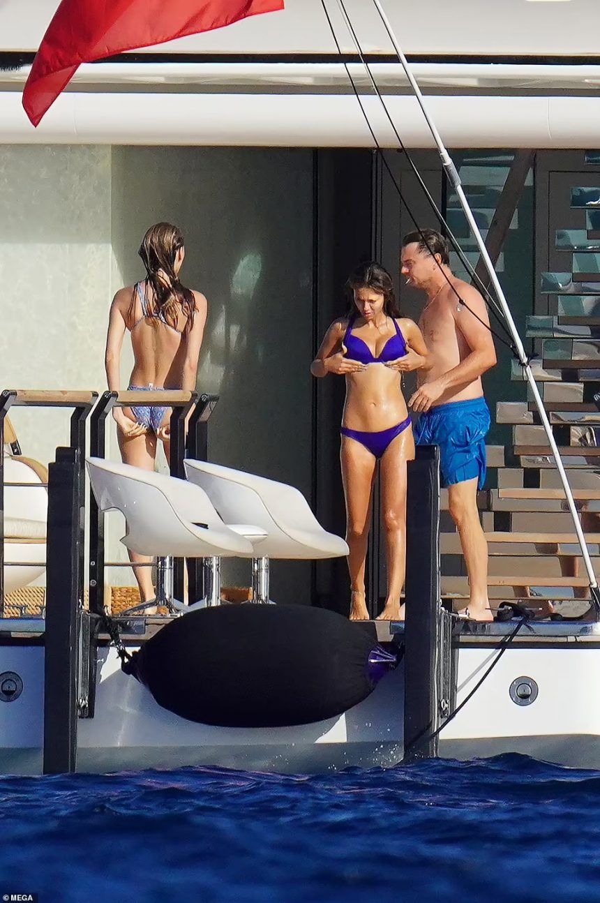 Лео, кој беше забележан на јахтата со другарот Тоби Мегваер, се прошета низ палубата во син костум за капење, пред да влезе во водата за ревитализирачко капење.
