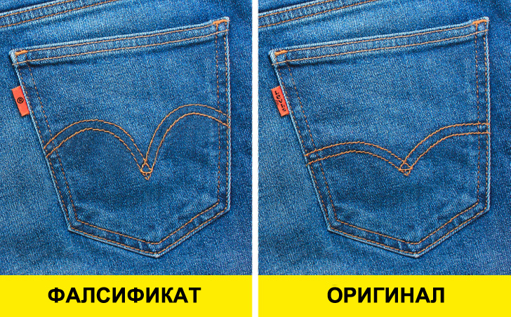 Покрај тоа, бојата на шевовите е традиционално портокалова на оригиналните фармерки, додека многу фалсификати користат бел конец.