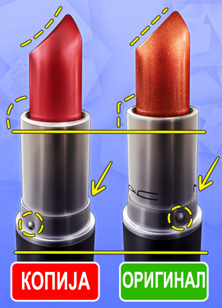 Првото нешто што можете да го проверите е бојата на апликаторот. Вистинскиот MAC кармин би бил сјаен, бидејќи е направен од алуминиум и челик. Во меѓувреме, фалсификуваната верзија би била потапа. Поради легираниот материјал, кармините MAC исто така треба да се чувствуваат потешки од лажните.