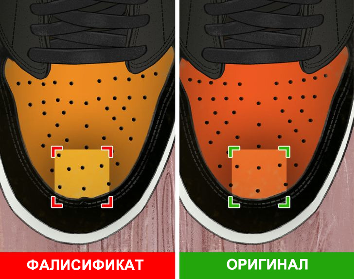 Обрнете внимание на нивните перфорации. Ако не поминат докрај низ кожата или не се правилно порамнети, тие се лажни. Патиките или нивните прсти не треба да бидат гломазни кога се во профил. Втиснувањето на логото на нивните крила нема да биде толку истакнато на лажниот пар.