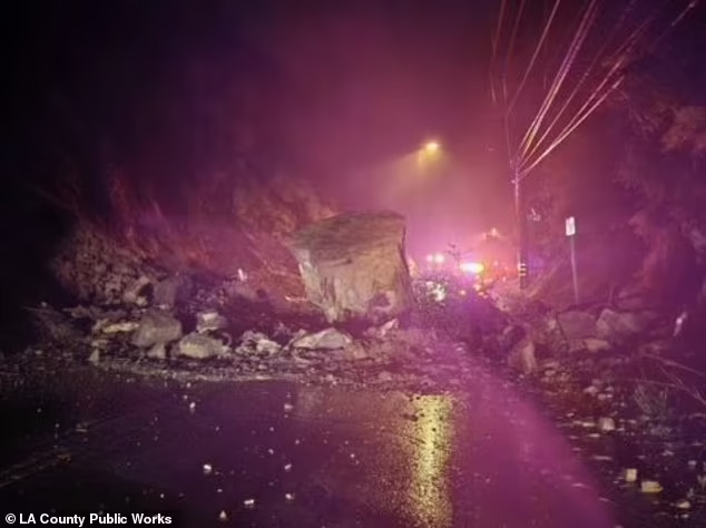 На исток, друг пат беше блокиран откако „голема карпа“ падна на патот Кањонот Малибу, целосно прекинувајќи го протокот на сообраќај во областа. Друго шокантно видео споделено од патролата на автопатот во Калифорнија во понеделникот покажува масивен камен, приближно со големина на возило, кој се урива на планината.