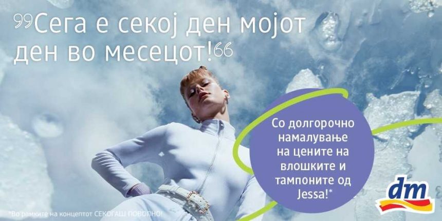 Со цел да ја поттикне менструалната правда, најголемиот дрогериски ланец во Европа – dm drogerie markt, од 1 февруари 2024 долгорочно ги намалува цените на влошките и тампоните од сопствената трговска марка Jessa, во рамките на ценовниот концепт СЕКОГАШ ПОВОЛНО. Покрај веќе поволните цени за производите вклучени во овој ценовен концепт, dm има за цел да придонесе за намалување на менструалната сиромаштија кај нас преку формирање на уште поповолни цени за овие производи. Активноста за намалување на цените се спроведува во сите држави од регионот, каде dm е присутен на пазарот, односно во Македонија, Србија, Хрватска, Босна и Херцеговина и Словенија.