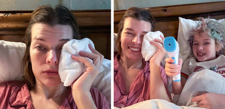 Мила може да се забавува со своите деца, дури и во моменти кога е повредена. Таа еднаш сподели фотографии на кои се гледа како нанесува влажна крпа на лицето.