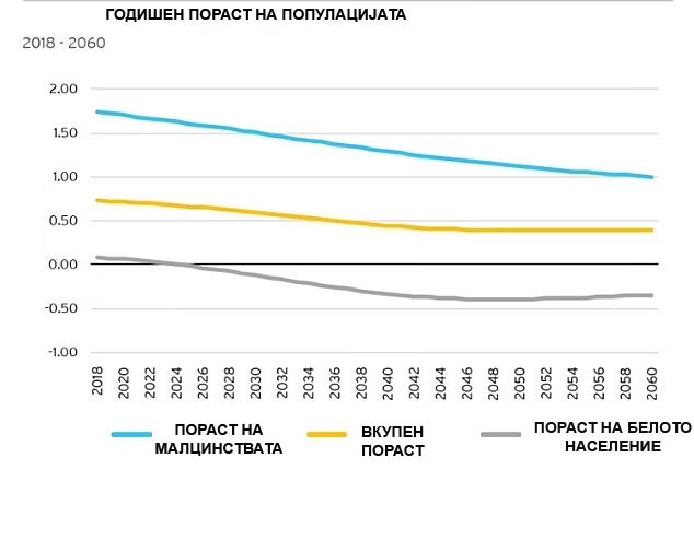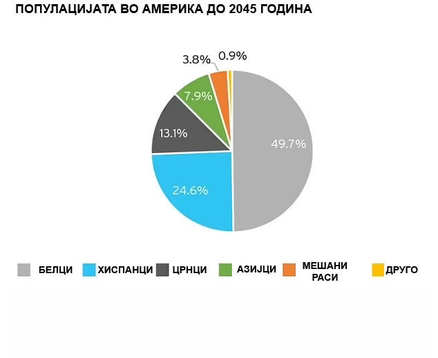 До 2060 година, белците ќе сочинуваат само 36 отсто од населението под 18 години, а Хиспанците ќе сочинуваат 32 отсто.