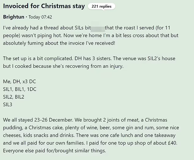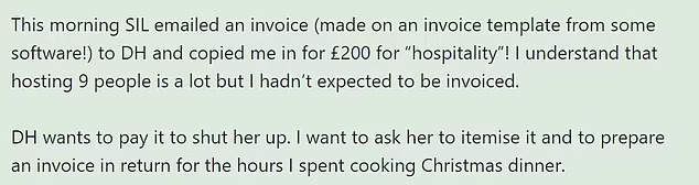 Мајка на три деца откри како останала запрепастена откако нејзината снаа и испратила фактура од 200 долари за да го покрие престојот на нејзиното семејство на Божиќ.