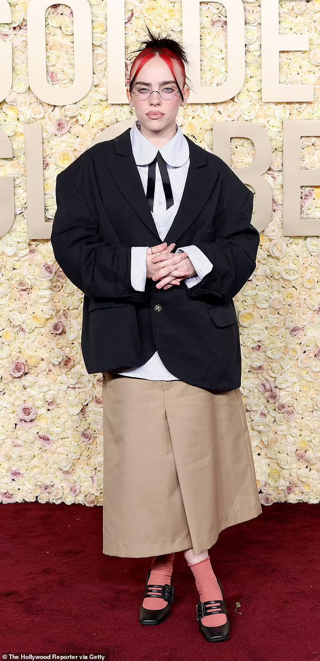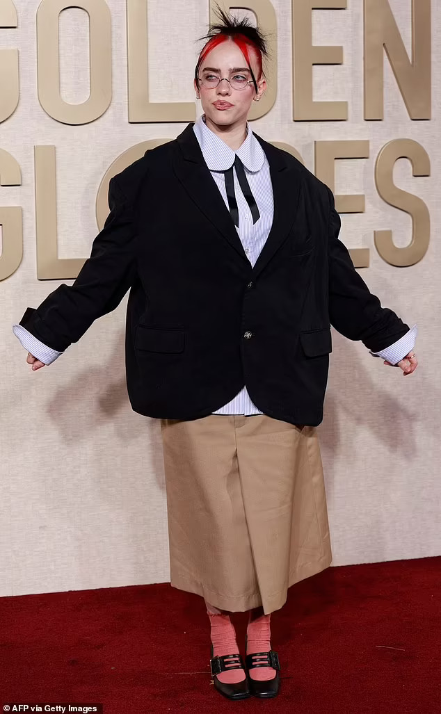 Модата пропадна! Били Ајлиш избра кафеаво здолниште и јакна од костум, кои ги спои со розови шарени чорапи и црни чевли.