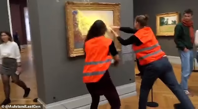 Двајца активисти во германскиот музеј „Барберини“ во Потсдам ја прекриле сликата „Les Meules“ на Клод Моне во пире од компири пред да се залепат на подот.