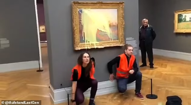 Активистите од групата за климатски активисти „Letzte Generation“ (Последна генерација) влегоа во музејот во неделата облечени во високи јакни пред да се приближат до сликата, која беше продадена на аукција за 110 милиони долари во 2019 година.