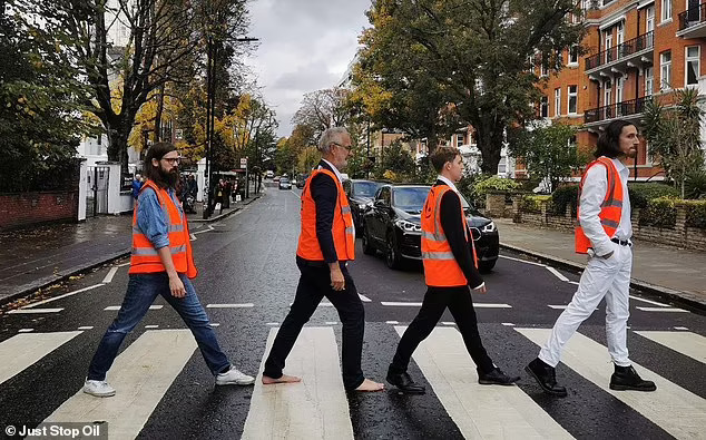 Веста доаѓа како што демонстрантите на Just Stop Oil го блокираа познатиот премин на Abbey Road во иста поза како Битлси додека го блокираа сообраќајот во Лондон за нивниот протест. Членовите на еко-толпата денеска во 13 часот тргнаа на пешачкиот премин во северозападен Лондон додека продолжуваат да предизвикуваат хаос на патиштата во главниот град.
