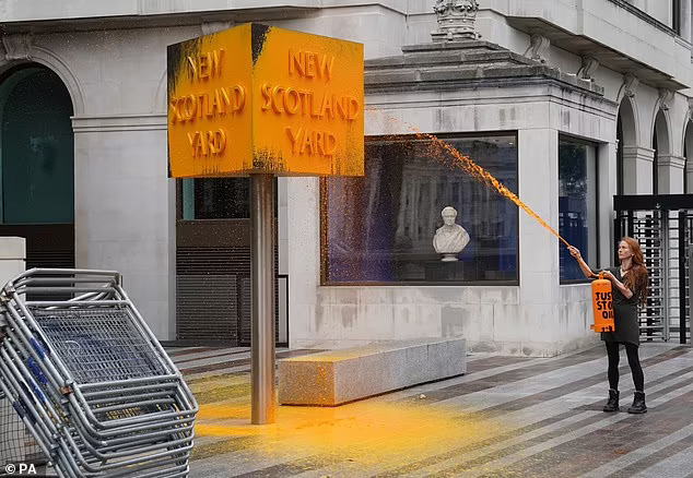 Неколку часа подоцна, други бунтовни еко-активисти од групата за кампања започнаа понижувачки напад против полицијата, прскајќи со портокалова боја над знакот на седиштето на Њу Скотланд Јард во Вестминстер, Лондон – што ги натера полицајците да уапсат 24 лица.