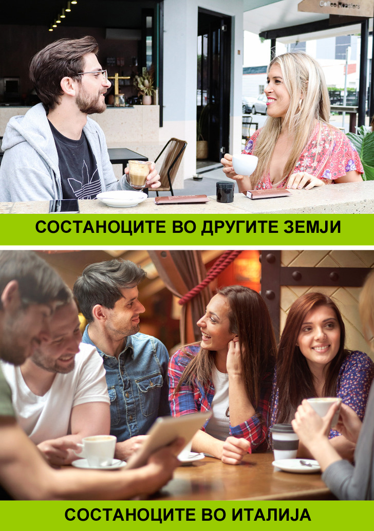 Италијанките не сакаат кога мажите премногу се трудат да ги импресионираат и да се покажат. Тие претпочитаат да започнат комуникација во пријателски стил. Затоа девојките често не организираат прв состанок еден на еден, туку ги повикуваат мажите да поминат време во друштво на нивните пријатели.