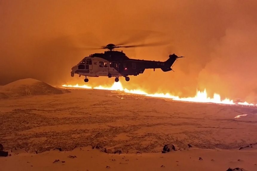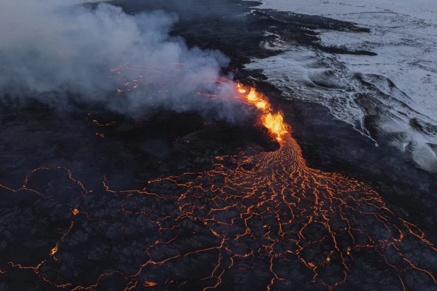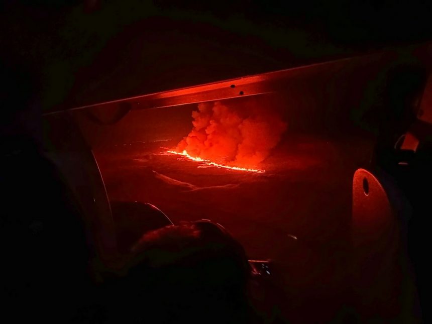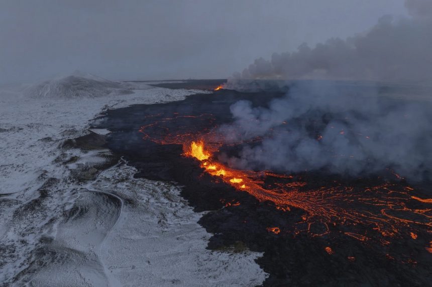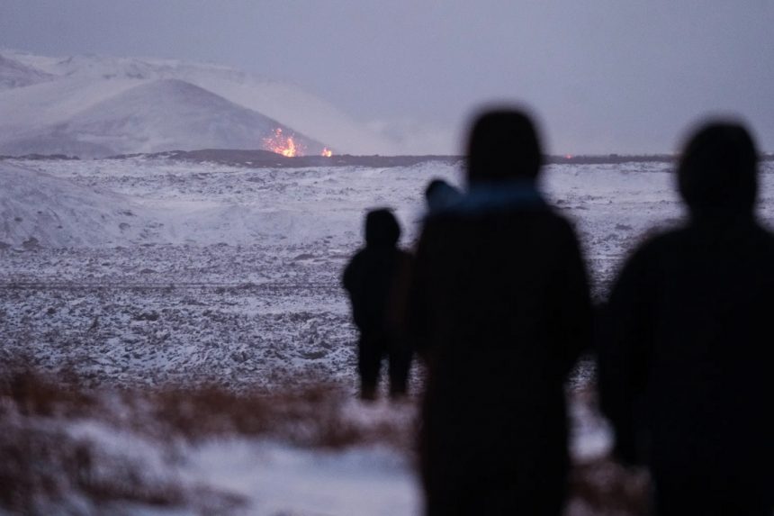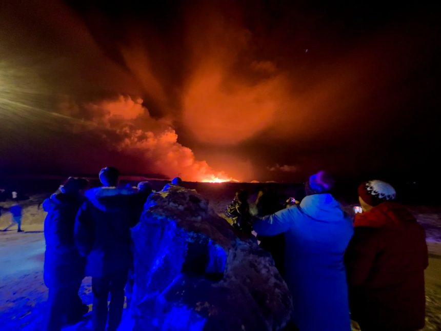 Огнена течност го осветлува зачаденото небо во Гриндавик, на само 50 километри од главниот град Рејкјавик.